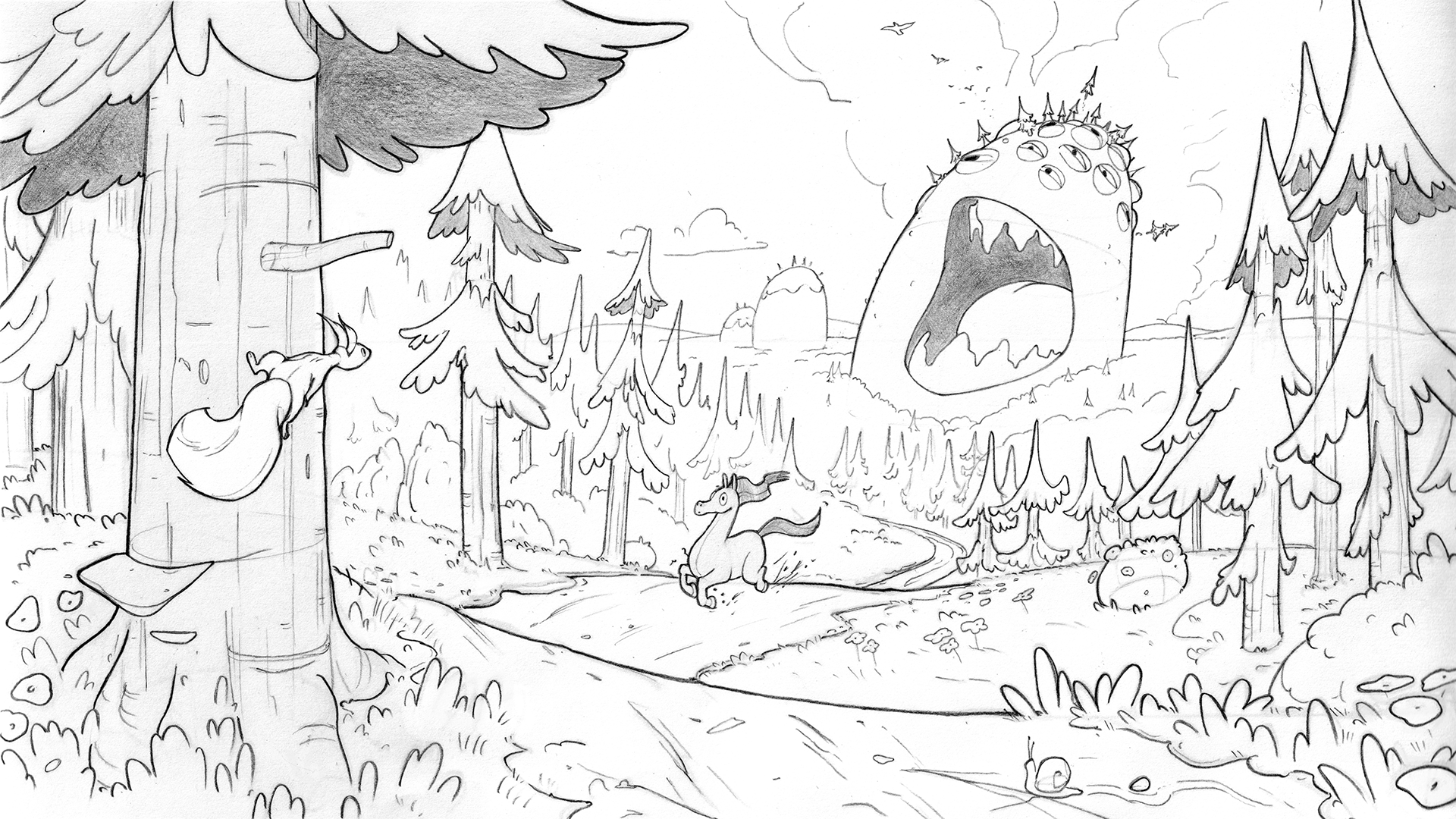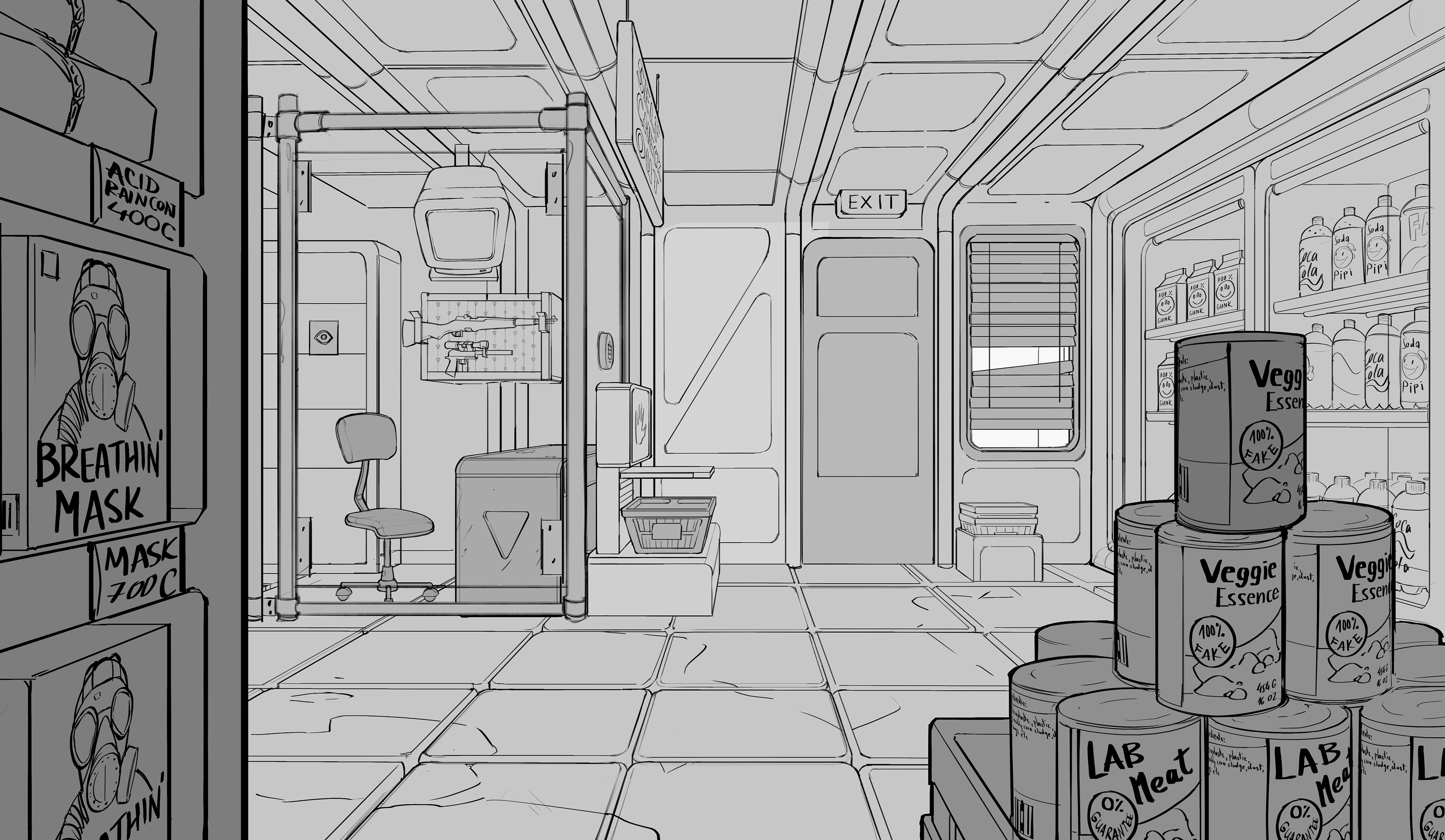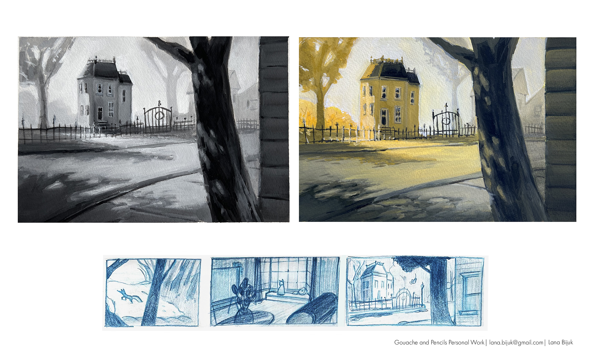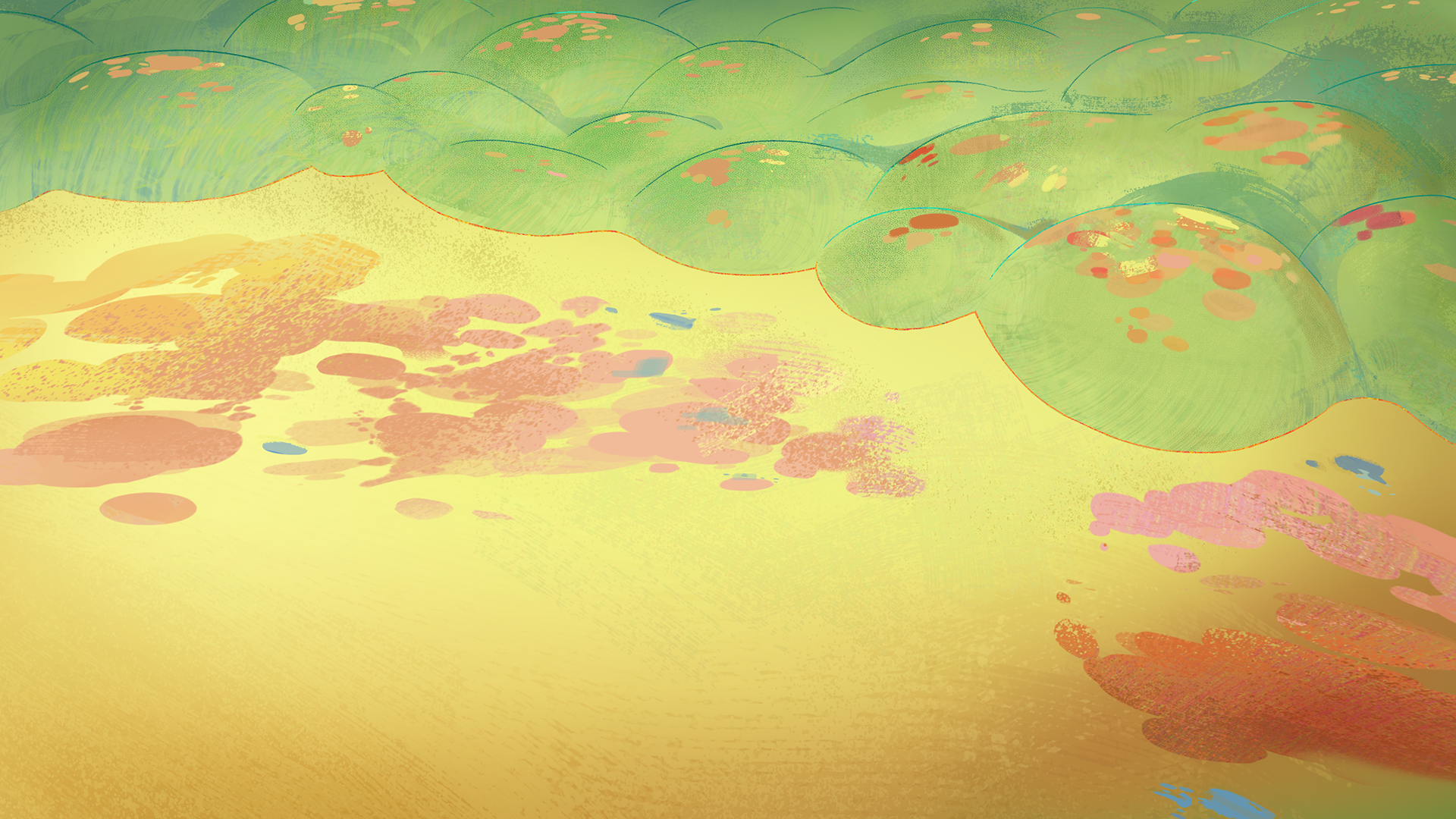 I painted these layouts referencing our storyboard panels (by Emily Habraken, Lucy Belon Murphy, Keane Lee) and color keys made by Alexa Chemikos. As a visual development lead one of my tasks was defining the painting style for our layouts.