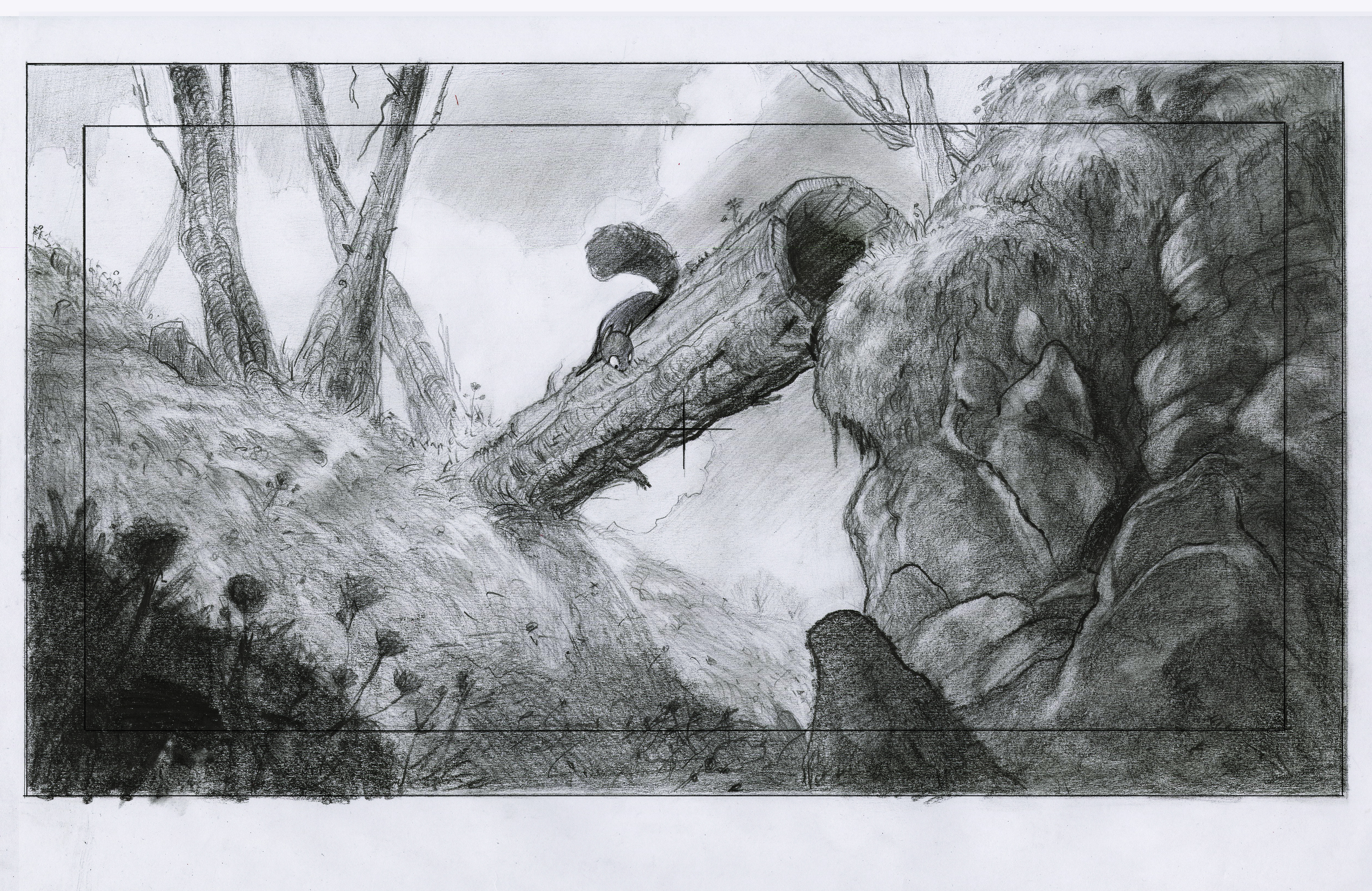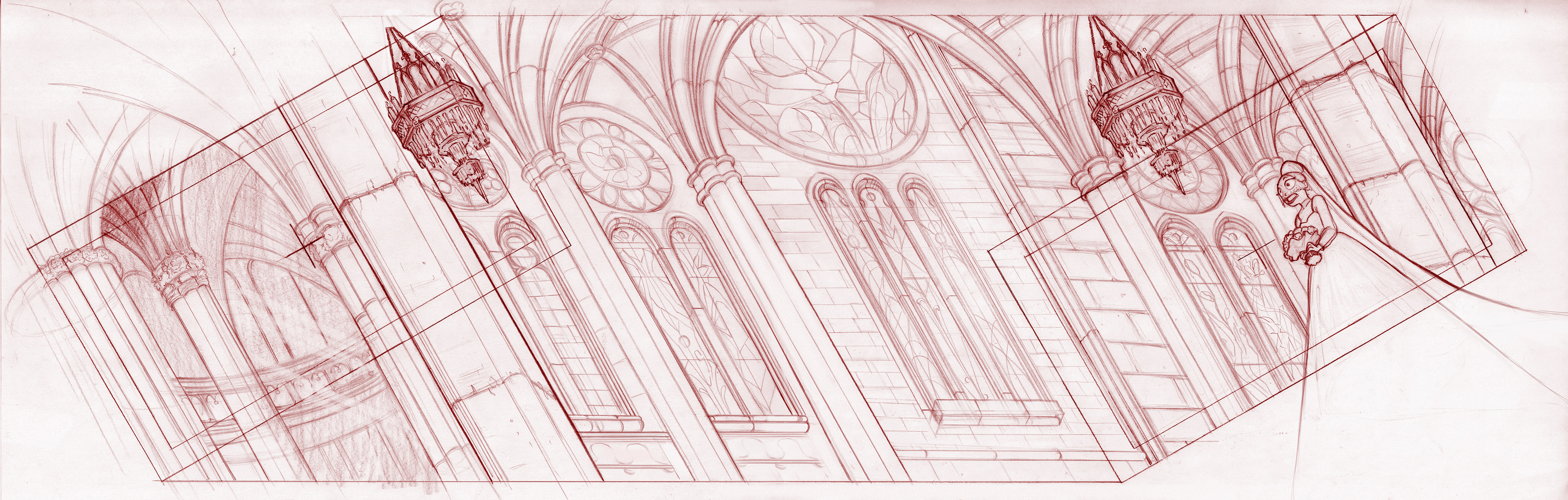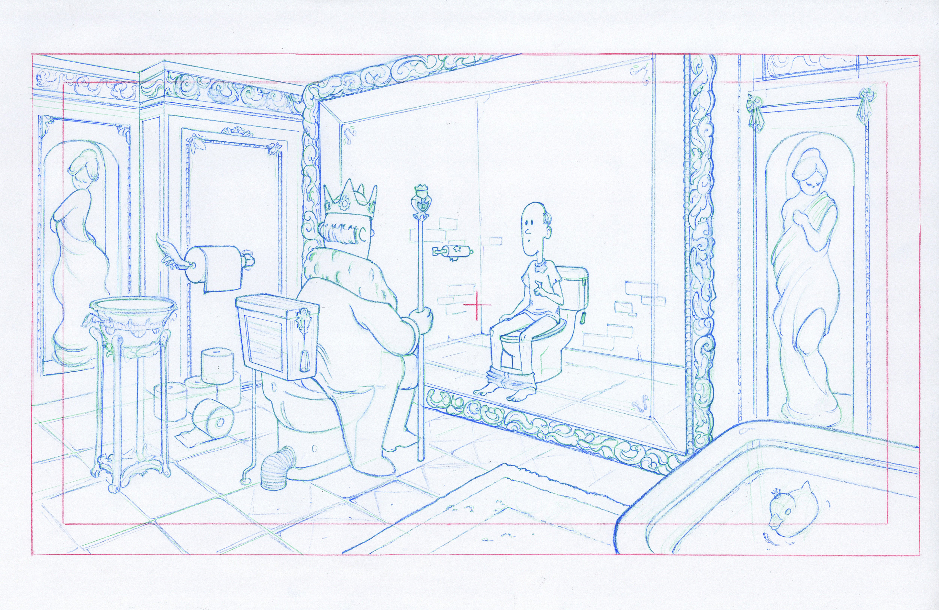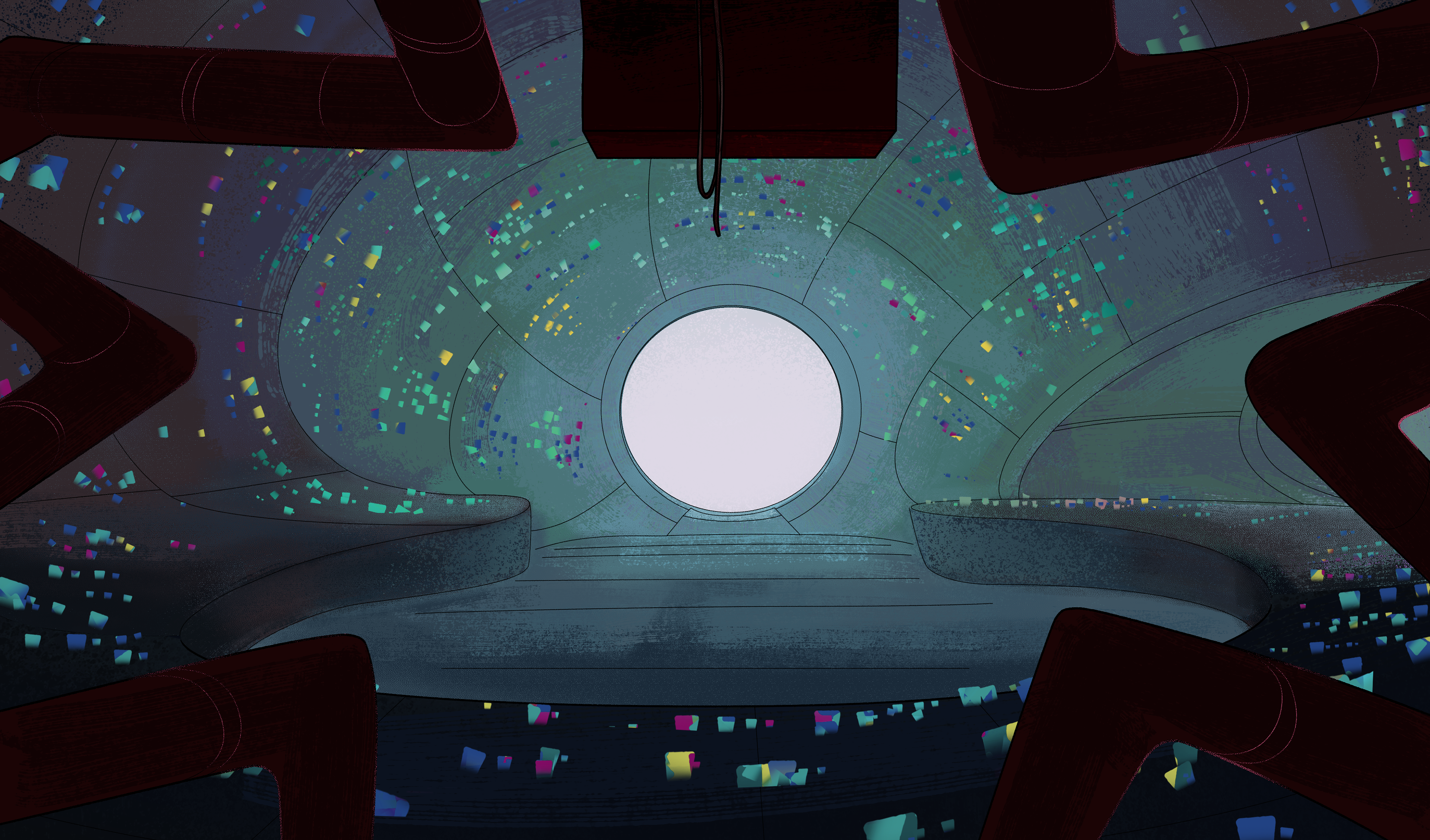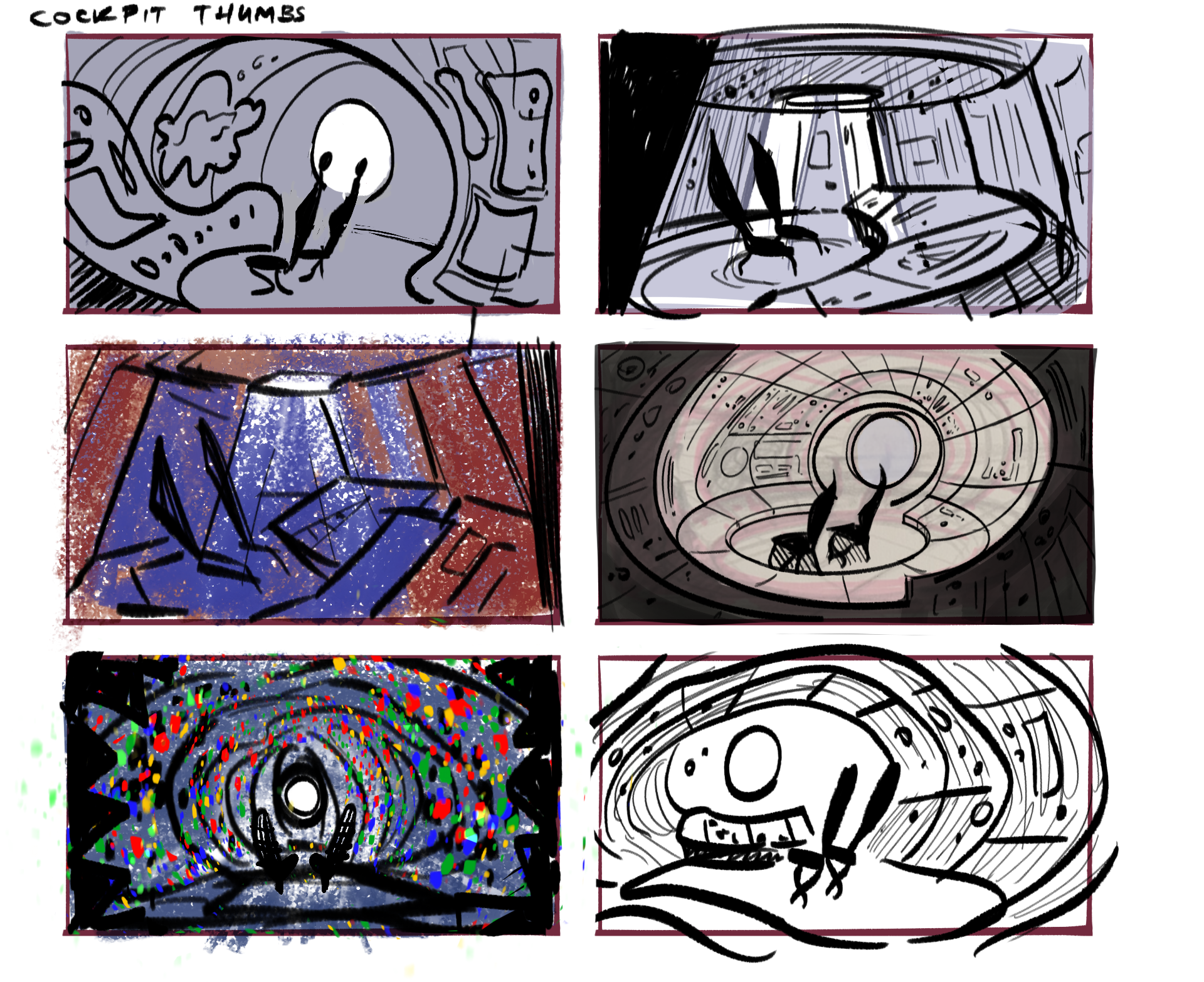 I painted these layouts referencing our storyboard panels (by Emily Habraken, Lucy Belon Murphy, Keane Lee) and color keys made by Alexa Chemikos. As a visual development lead one of my tasks was defining the painting style for our layouts.